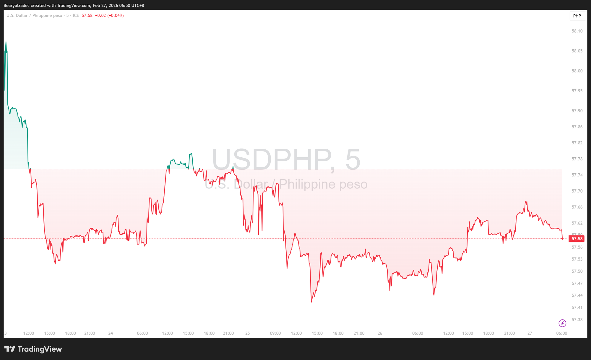 Meanwhile, the Philippine peso settled at 57.55 against the US dollar.